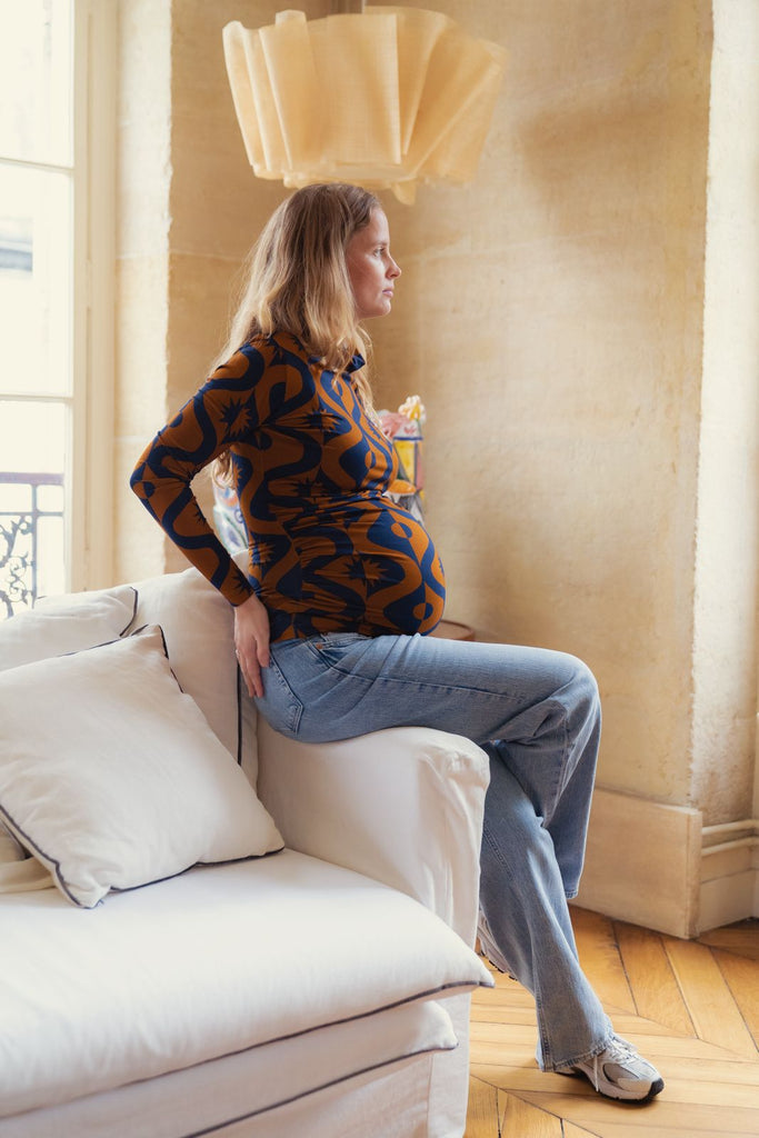 - Fronces de 15 cm sur les 2 côtés en bas du devant du haut, ce qui permet au top d'épouser parfaitement la forme du ventre.