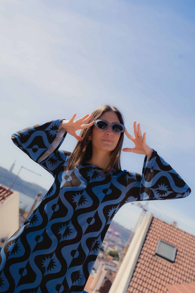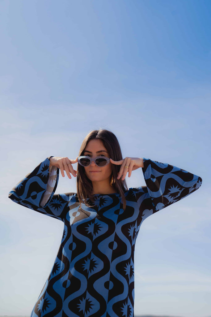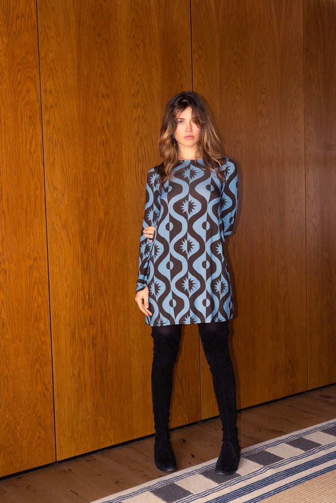 - Coupe droite évasée, longueur au dessus du genoux (inspiration année 60).